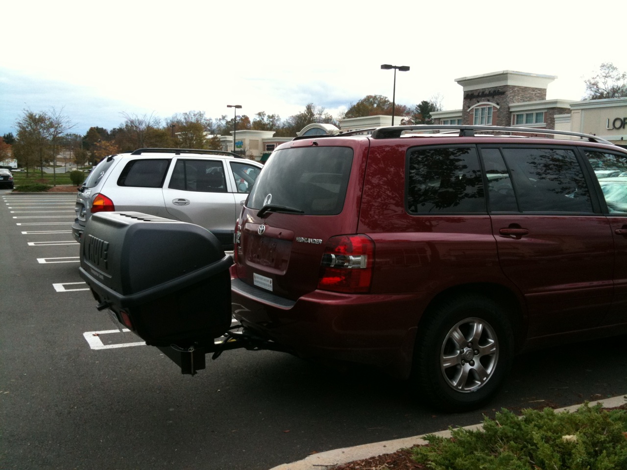 I stopped at ProLine in Wallingford, CT since they sell this, which is a cargo carrier with 3 features I really need: an accessible height, plenty of space, and a swing-arm so I don’t have to fight with the box to get to the back of the car.