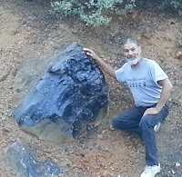 This piece has been hacked at by amateur geologists trying, and failing, to collect that enormous sample — well, trophy. J was just being friendly, but the edges are just as glassy-sharp as if he had had more hostile intentions.